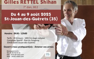 Stage aïkido été 2025Dates Du 4 au 9 août 2025Cours Aïkido : 9h30-12h00 Enseignant Gilles Rettel Shihan7e dan - 6e dan Aïkikaï - BE2/DESTélécharger l'afficheLieu Complexe sportifEntrée sur le rond-point rue du Fougeray/rue de la Croix aux Merles35430...
